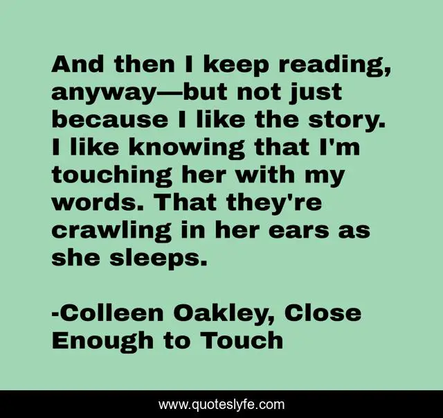 This page presents the quote "And then I keep reading, anyway—but not just because I like the story. I like knowing that I'm touching her with my words. That they're crawling in her ears as she sleeps.". Author of this quote is Colleen Oakley, Close Enough to Touch. This quote is about books, love, reading, affection,.