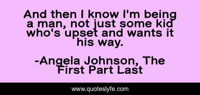 This page presents the quote "And then I know I'm being a man, not just some kid who's upset and wants it his way.". Author of this quote is Angela Johnson, The First Part Last. This quote is about coming-of-age, adults, growing-up,.