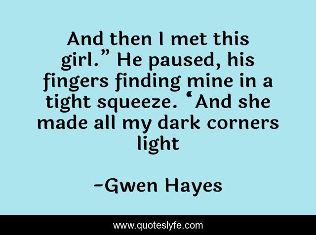 This page presents the quote "And then I met this girl.” He paused, his fingers finding mine in a tight squeeze. “And she made all my dark corners light". Author of this quote is Gwen Hayes. This quote is about paranormal-romance, demons, bad-boys,.