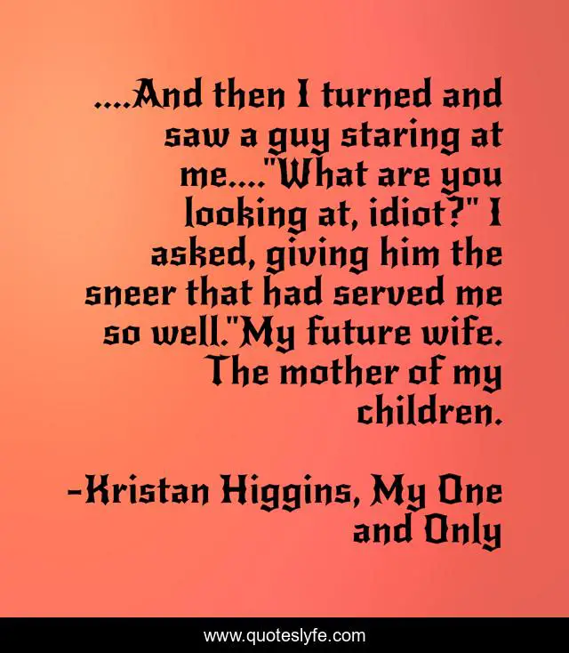 This page presents the quote "....And then I turned and saw a guy staring at me...."What are you looking at, idiot?" I asked, giving him the sneer that had served me so well."My future wife. The mother of my children.". Author of this quote is Kristan Higgins, My One and Only. This quote is about romance, cheesy,.