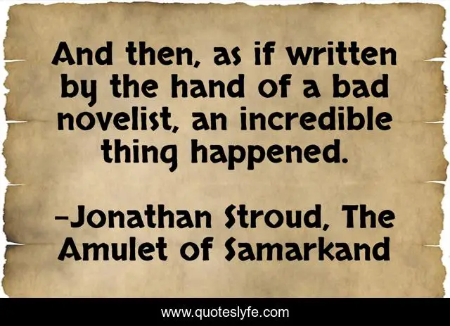 This page presents the quote "And then, as if written by the hand of a bad novelist, an incredible thing happened.". Author of this quote is Jonathan Stroud, The Amulet of Samarkand. This quote is about humour, luck,.