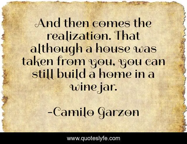 This page presents the quote "And then comes the realization. That although a house was taken from you, you can still build a home in a wine jar.". Author of this quote is Camilo Garzon. This quote is about camilo-garzon, cynics, colombian-literature, diogenes, home,.