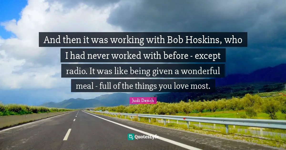 This page presents the quote "And then it was working with Bob Hoskins, who I had never worked with before - except radio. It was like being given a wonderful meal - full of the things you love most.". Author of this quote is Judi Dench. This quote is about meals, given, wonderful, radio, things you love, bob,.