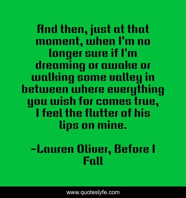 This page presents the quote "And then, just at that moment, when I'm no longer sure if I'm dreaming or awake or walking some valley in between where everything you wish for comes true, I feel the flutter of his lips on mine.". Author of this quote is Lauren Oliver, Before I Fall. This quote is about romantic, dreaming,.