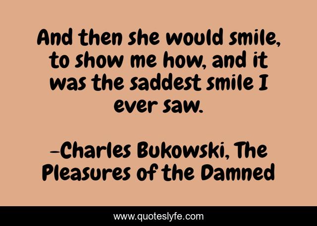 This page presents the quote "And then she would smile, to show me how, and it was the saddest smile I ever saw.". Author of this quote is Charles Bukowski, The Pleasures of the Damned. .