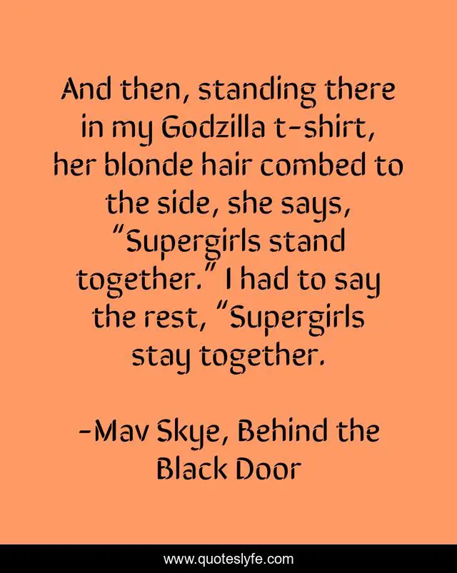 This page presents the quote "And then, standing there in my Godzilla t-shirt, her blonde hair combed to the side, she says, “Supergirls stand together.” I had to say the rest, “Supergirls stay together.". Author of this quote is Mav Skye, Behind the Black Door. .