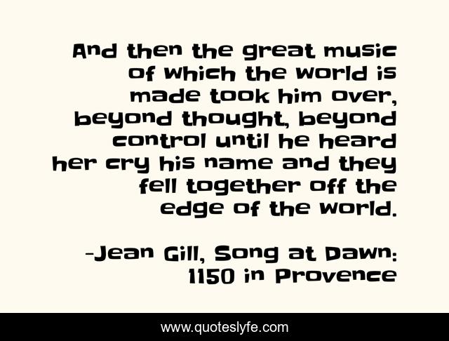 This page presents the quote "And then the great music of which the world is made took him over, beyond thought, beyond control until he heard her cry his name and they fell together off the edge of the world.". Author of this quote is Jean Gill, Song at Dawn: 1150 in Provence. This quote is about love, troubadour, song, music, historical, passion, affection,.