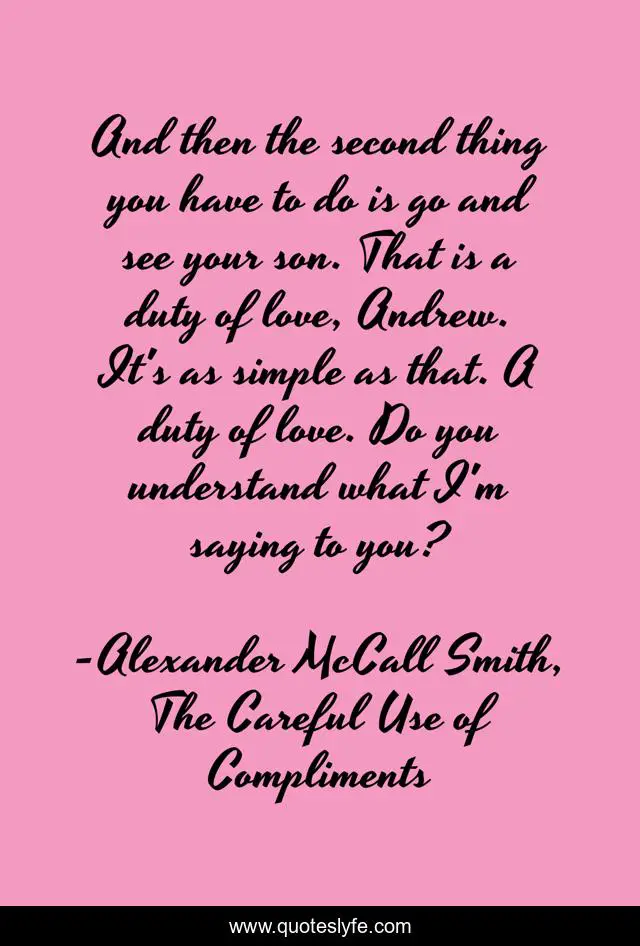 This page presents the quote "And then the second thing you have to do is go and see your son. That is a duty of love, Andrew. It's as simple as that. A duty of love. Do you understand what I'm saying to you?". Author of this quote is Alexander McCall Smith, The Careful Use of Compliments. This quote is about witty, ruminative-and-wise,.