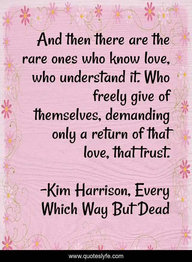 This page presents the quote "And then there are the rare ones who know love, who understand it. Who freely give of themselves, demanding only a return of that love, that trust.". Author of this quote is Kim Harrison, Every Which Way But Dead. This quote is about kisten, vampire, fiction, romance, supernatural, rachel-morgan,.