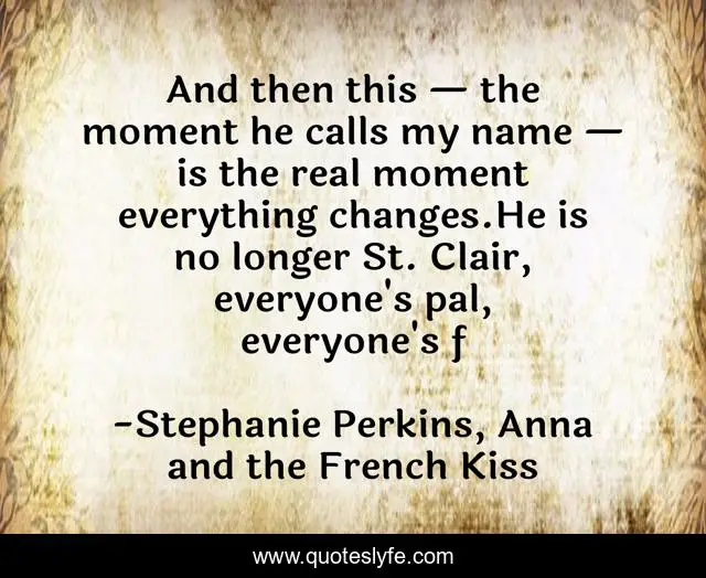 This page presents the quote "And then this — the moment he calls my name — is the real moment everything changes.He is no longer St. Clair, everyone's pal, everyone's f". Author of this quote is Stephanie Perkins, Anna and the French Kiss. This quote is about falling-in-love, love, affection,.