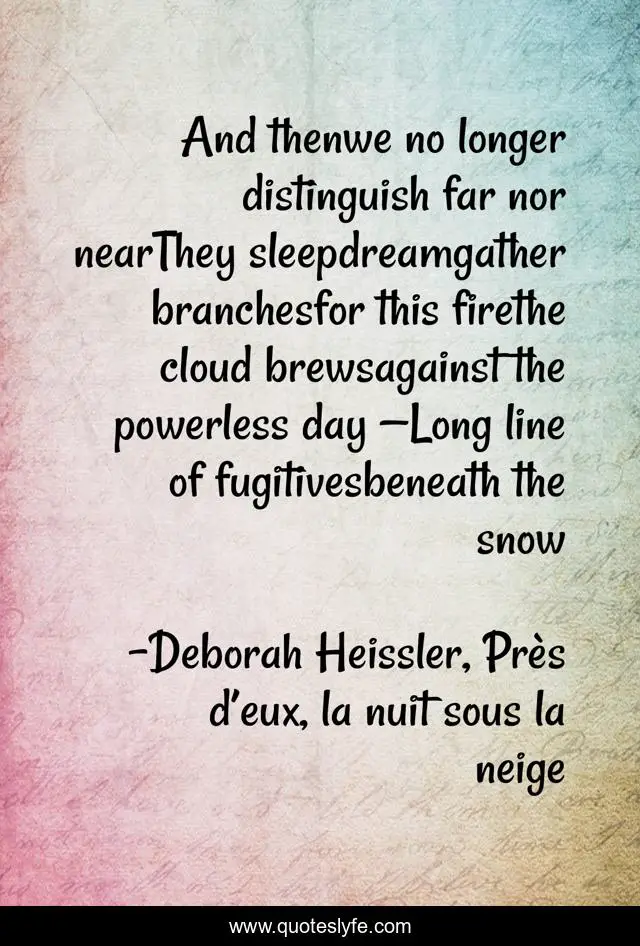 This page presents the quote "And thenwe no longer distinguish far nor nearThey sleepdreamgather branchesfor this firethe cloud brewsagainst the powerless day —Long line of fugitivesbeneath the snow". Author of this quote is Deborah Heissler, Près d’eux, la nuit sous la neige. .