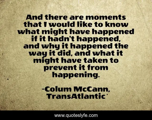 This page presents the quote "And there are moments that I would like to know what might have happened if it hadn't happened, and why it happened the way it did, and what it might have taken to prevent it from happening.". Author of this quote is Colum McCann, TransAtlantic. This quote is about moments, what-if,.