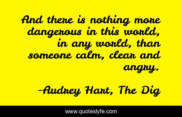 This page presents the quote "And there is nothing more dangerous in this world, in any world, than someone calm, clear and angry.". Author of this quote is Audrey Hart, The Dig. This quote is about angry, audrey-hart, danger,.
