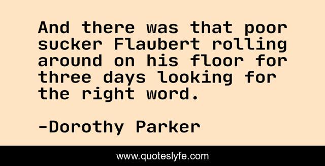 This page presents the quote "And there was that poor sucker Flaubert rolling around on his floor for three days looking for the right word.". Author of this quote is Dorothy Parker. This quote is about flaubert, humor, on-writing, writing,.