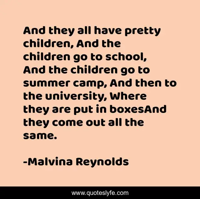 This page presents the quote "And they all have pretty children, And the children go to school, And the children go to summer camp, And then to the university, Where they are put in boxesAnd they come out all the same.". Author of this quote is Malvina Reynolds. .