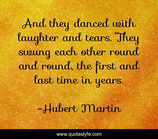 This page presents the quote "And they danced with laughter and tears. They swung each other round and round, the first and last time in years.". Author of this quote is Hubert Martin. This quote is about love, honesty, intelligence, deep, sleep, best, poem, confidence, humor,.