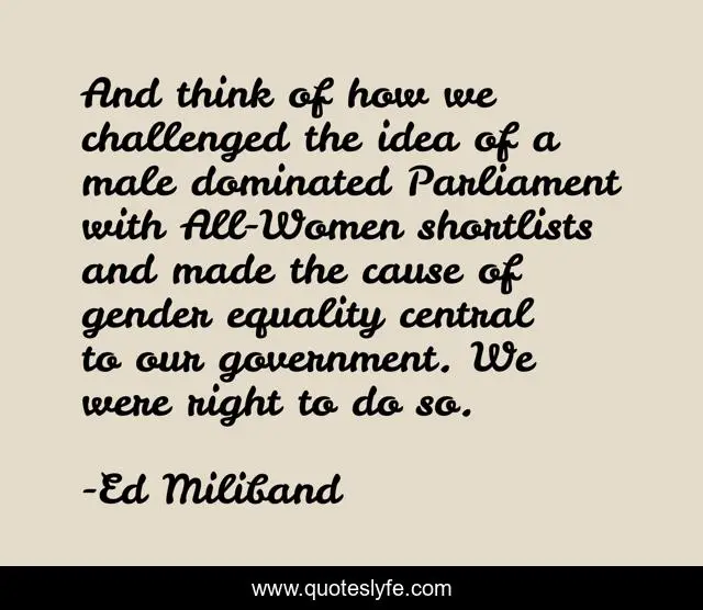 This page presents the quote "And think of how we challenged the idea of a male dominated Parliament with All-Women shortlists and made the cause of gender equality central to our government. We were right to do so.". Author of this quote is Ed Miliband. This quote is about gender, think, government,.