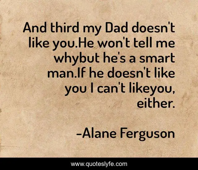 This page presents the quote "And third my Dad doesn't like you.He won't tell me whybut he's a smart man.If he doesn't like you I can't likeyou, either.". Author of this quote is Alane Ferguson. This quote is about book, alane-ferguson, christopher-killer,.