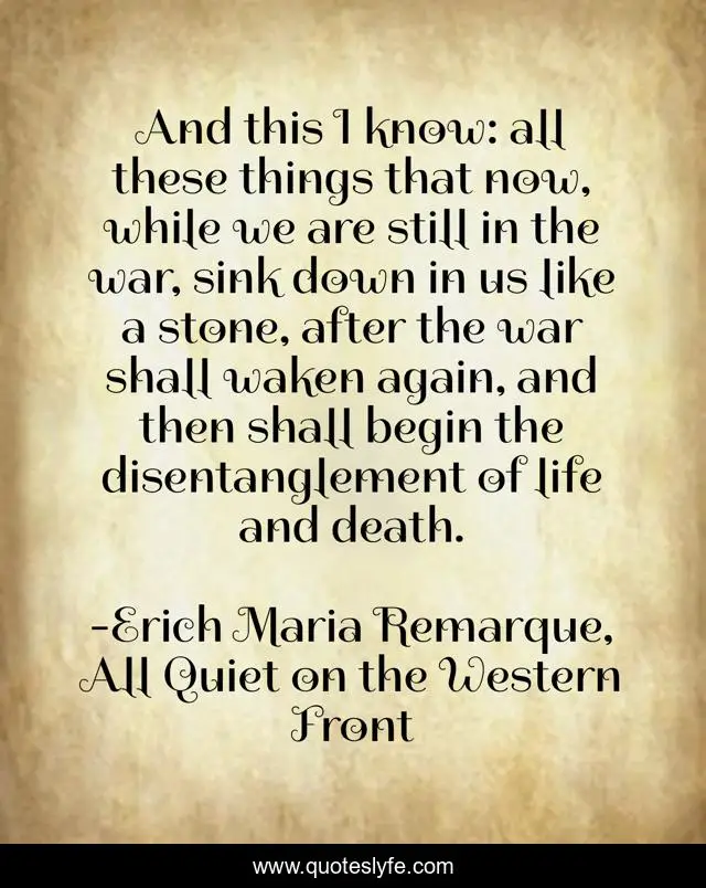 This page presents the quote "And this I know: all these things that now, while we are still in the war, sink down in us like a stone, after the war shall waken again, and then shall begin the disentanglement of life and death.". Author of this quote is Erich Maria Remarque, All Quiet on the Western Front. This quote is about after-war, soldier, life-and-death, all-quiet-on-the-western-front, soldiers, wwi, war,.