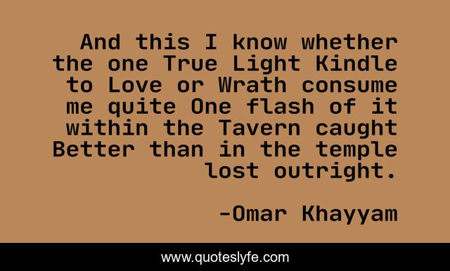 This page presents the quote "And this I know whether the one True Light Kindle to Love or Wrath consume me quite One flash of it within the Tavern caught Better than in the temple lost outright.". Author of this quote is Omar Khayyam. .