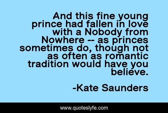 This page presents the quote "And this fine young prince had fallen in love with a Nobody from Nowhere -- as princes sometimes do, though not as often as romantic tradition would have you believe.". Author of this quote is Kate Saunders. This quote is about commoners, falling-in-love, princes,.