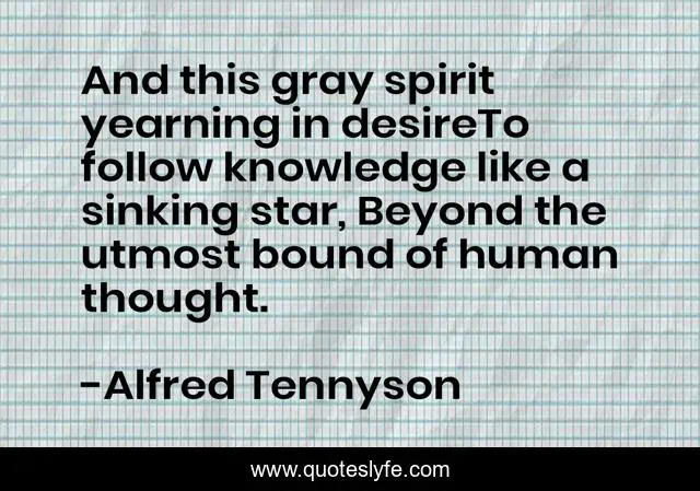 This page presents the quote "And this gray spirit yearning in desireTo follow knowledge like a sinking star, Beyond the utmost bound of human thought.". Author of this quote is Alfred Tennyson. This quote is about poetry, ulysses,.
