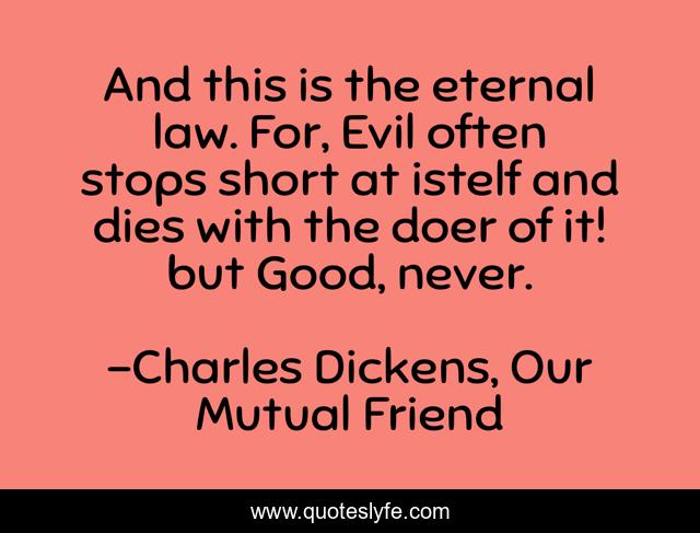 This page presents the quote "And this is the eternal law. For, Evil often stops short at istelf and dies with the doer of it! but Good, never.". Author of this quote is Charles Dickens, Our Mutual Friend. This quote is about eternal-truths, goodness,.