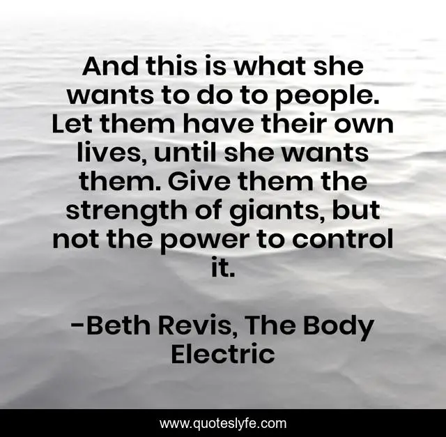This page presents the quote "And this is what she wants to do to people. Let them have their own lives, until she wants them. Give them the strength of giants, but not the power to control it.". Author of this quote is Beth Revis, The Body Electric. This quote is about control, power, manipulation,.
