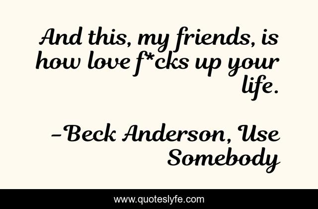 This page presents the quote "And this, my friends, is how love f*cks up your life.". Author of this quote is Beck Anderson, Use Somebody. This quote is about alpha-male, life, love, contemporary-romance, fly-fishing, agent, romance, idaho, love-hurts,.