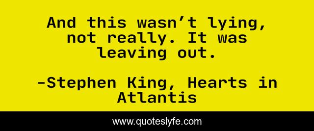 This page presents the quote "And this wasn’t lying, not really. It was leaving out.". Author of this quote is Stephen King, Hearts in Atlantis. .