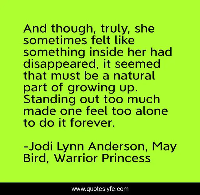 This page presents the quote "And though, truly, she sometimes felt like something inside her had disappeared, it seemed that must be a natural part of growing up. Standing out too much made one feel too alone to do it forever.". Author of this quote is Jodi Lynn Anderson, May Bird, Warrior Princess. This quote is about alone, may-bird, loneliness, growing-up, standing-out,.