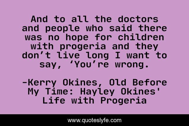This page presents the quote "And to all the doctors and people who said there was no hope for children with progeria and they don’t live long I want to say, ‘You’re wrong.". Author of this quote is Kerry Okines, Old Before My Time: Hayley Okines' Life with Progeria. This quote is about wrong, hope, doctors,.