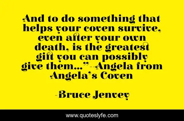 This page presents the quote "And to do something that helps your coven survive, even after your own death, is the greatest gift you can possibly give them…”--Angela from Angela’s Coven". Author of this quote is Bruce Jenvey. This quote is about fantasy, paranormal, witches,.