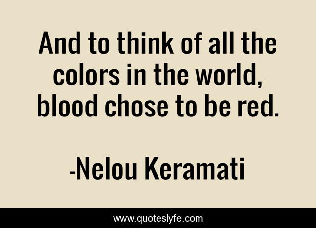 This page presents the quote "And to think of all the colors in the world, blood chose to be red.". Author of this quote is Nelou Keramati. This quote is about the-fray-theory, ya, the-fray-theory-resonance, ya-urban-fantasy, urban-fantasy, paranormal, ya-romance, young-adult-romance, romance,.