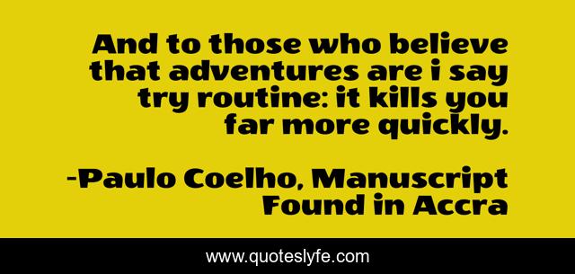 This page presents the quote "And to those who believe that adventures are i say try routine: it kills you far more quickly.". Author of this quote is Paulo Coelho, Manuscript Found in Accra. This quote is about enthusiasm, life, adventure, inspirational, routine,.