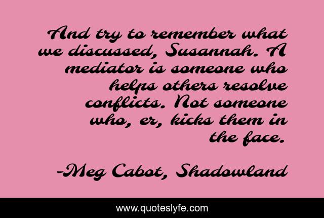 This page presents the quote "And try to remember what we discussed, Susannah. A mediator is someone who helps others resolve conflicts. Not someone who, er, kicks them in the face.". Author of this quote is Meg Cabot, Shadowland. .