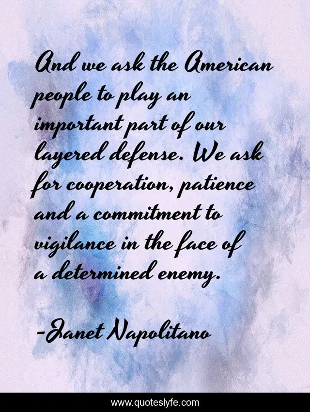 This page presents the quote "And we ask the American people to play an important part of our layered defense. We ask for cooperation, patience and a commitment to vigilance in the face of a determined enemy.". Author of this quote is Janet Napolitano. This quote is about american, commitment, people,.