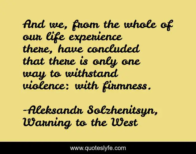 This page presents the quote "And we, from the whole of our life experience there, have concluded that there is only one way to withstand violence: with firmness.". Author of this quote is Aleksandr Solzhenitsyn, Warning to the West. This quote is about violence, soviet-union, resistance,.