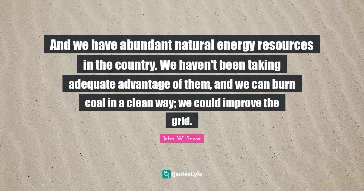 This page presents the quote "And we have abundant natural energy resources in the country. We haven't been taking adequate advantage of them, and we can burn coal in a clean way; we could improve the grid.". Author of this quote is John W. Snow. This quote is about way, resources, advantage, country, clean, coal, adequate, energy, natural,.