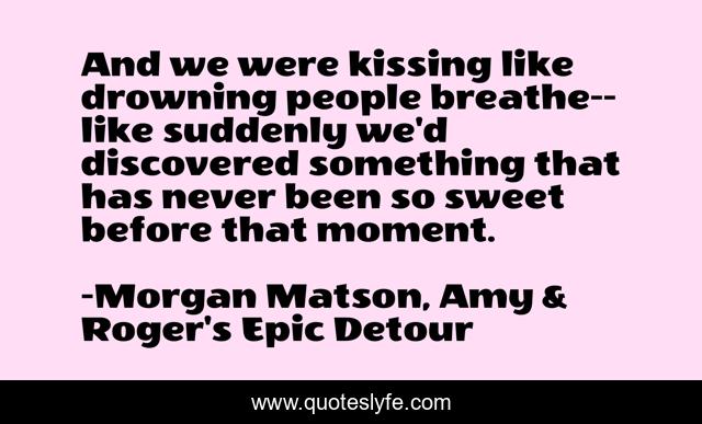 This page presents the quote "And we were kissing like drowning people breathe-- like suddenly we'd discovered something that has never been so sweet before that moment.". Author of this quote is Morgan Matson, Amy & Roger's Epic Detour. This quote is about romance, kissing, love, kiss, affection,.