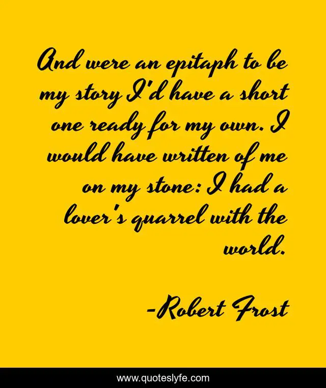 This page presents the quote "And were an epitaph to be my story I'd have a short one ready for my own. I would have written of me on my stone: I had a lover's quarrel with the world.". Author of this quote is Robert Frost. .