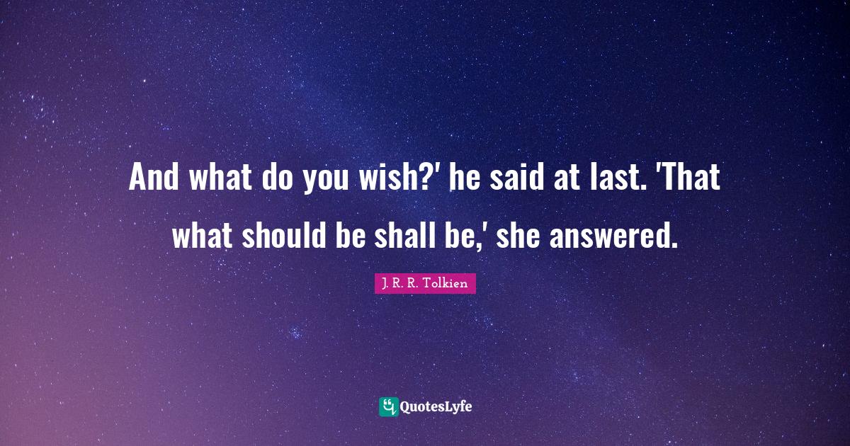This page presents the quote "And what do you wish?' he said at last. 'That what should be shall be,' she answered.". Author of this quote is J. R. R. Tolkien. This quote is about said, wish, galadriel, lasts,.