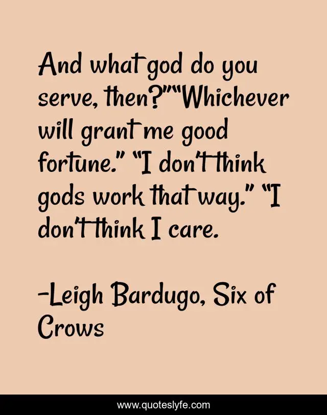This page presents the quote "And what god do you serve, then?”“Whichever will grant me good fortune.” “I don’t think gods work that way.” “I don’t think I care.". Author of this quote is Leigh Bardugo, Six of Crows. This quote is about inej-ghafa, faith, kaz-brekker, six-of-crows,.