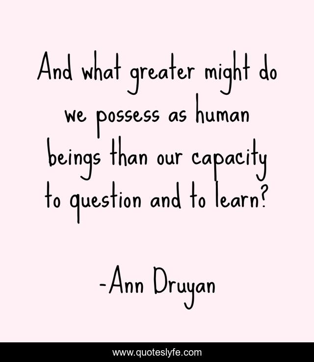 This page presents the quote "And what greater might do we possess as human beings than our capacity to question and to learn?". Author of this quote is Ann Druyan. This quote is about carl-sagan, science, theology, thought-provoking, inspirational, enthusiasm, ann-druyan,.