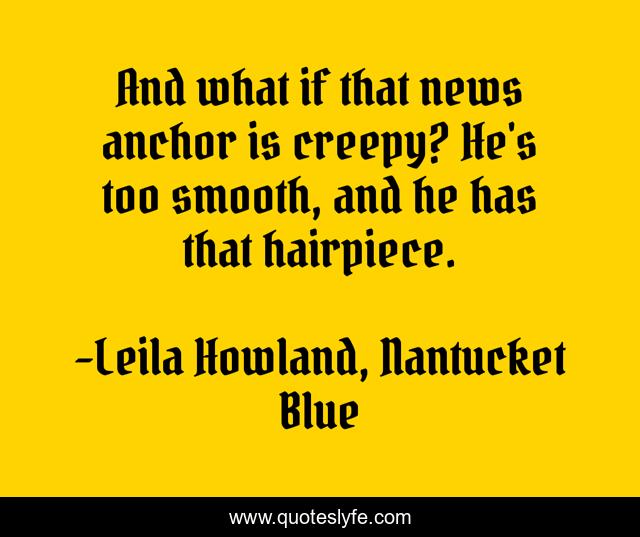This page presents the quote "And what if that news anchor is creepy? He's too smooth, and he has that hairpiece.". Author of this quote is Leila Howland, Nantucket Blue. This quote is about blue, cute, nantucket, humor,.