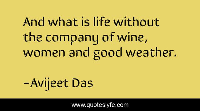 This page presents the quote "And what is life without the company of wine, women and good weather.". Author of this quote is Avijeet Das. This quote is about life, valentines, love, writer, weather, women, affection, wine,.