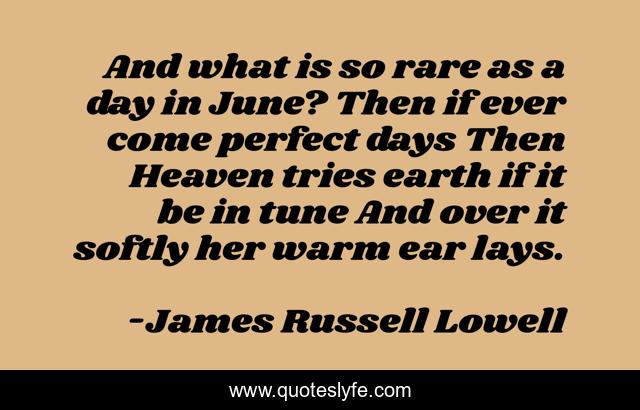 This page presents the quote "And what is so rare as a day in June? Then if ever come perfect days Then Heaven tries earth if it be in tune And over it softly her warm ear lays.". Author of this quote is James Russell Lowell. .