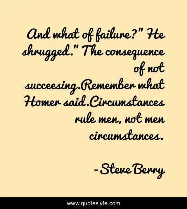 This page presents the quote "And what of failure?"He shrugged."The consequence of not succeesing.Remember what Homer said.Circumstances rule men, not men circumstances.". Author of this quote is Steve Berry. This quote is about failure, life, men,.