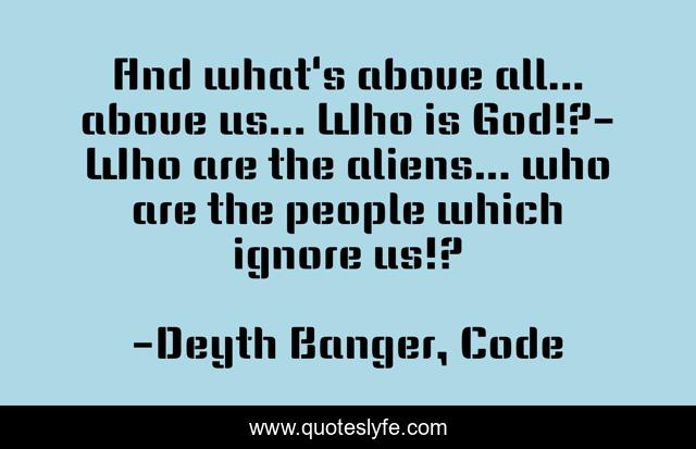 This page presents the quote "And what's above all... above us... Who is God!?- Who are the aliens... who are the people which ignore us!?". Author of this quote is Deyth Banger, Code. This quote is about code, true, level,.
