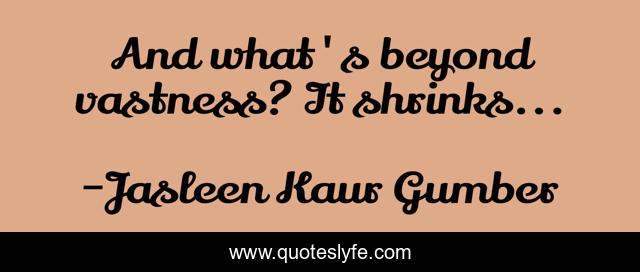 "Jasleen Kaur Gumber Quotes." Quoteslyfe.com, 2025. Sat. 06 Dec. 2025. <https://www.quoteslyfe.com/quote/And-what-s-beyond-vastness-It-shrinks-142301>.